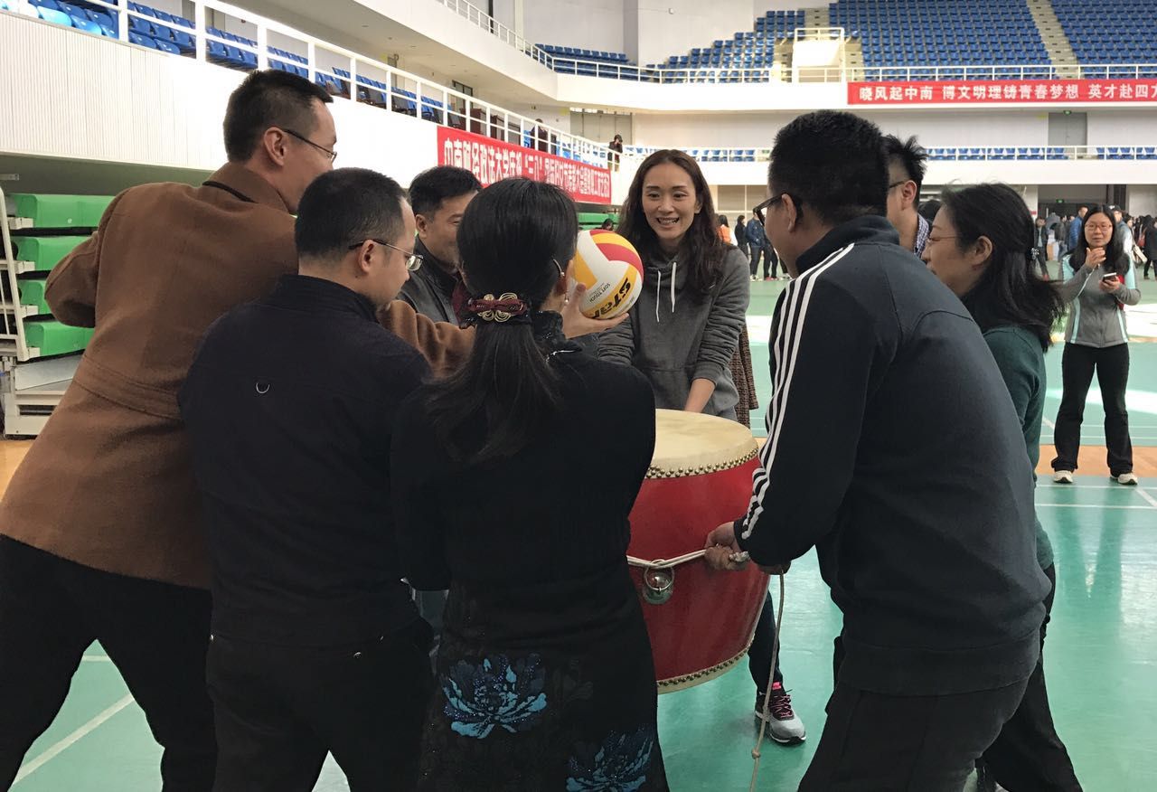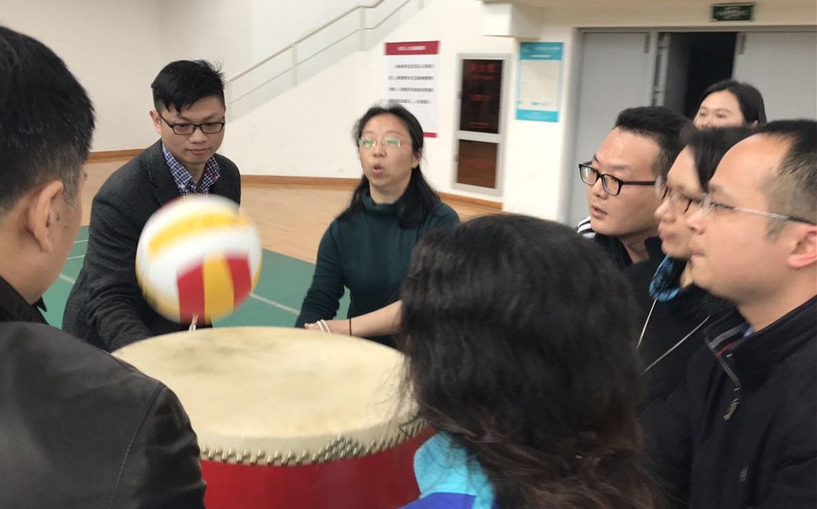同心鼓是唯一要求男教工共同参与的比赛。参赛者须一起用力使鼓有节奏地平稳地把排球连续颠起,在3分钟内全队颠球的次数为本队的最后成绩。比赛前,经验丰富的李芳副书记与大家分享了颠球要领:球不能颠得太高,鼓面一定要平稳!比赛开始,李书记一边喊着口号一边与我院其他参赛者拉起大鼓稳稳地颠球,气氛十分紧张。我院参赛者屏气凝神,整个过程丝毫没有一丝松懈,一点失误,真正做到了同心协力,最终取得了3分钟颠球320余下的惊人成绩。