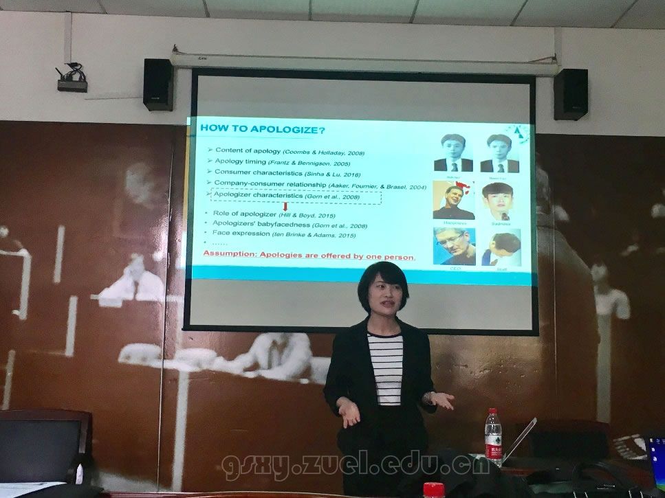 冉雅旋此次学术分享的主题是:One or many? Why more apologizers hinder apology effectiveness。她首先列举“企业丑闻曝光后企业道歉的人数不尽相同“这一社会现象,案例贴近生活激起了大家的兴趣。接着她举了在交流过程中,交流对象是一人或多人的状态是有差异的,从而引入“在企业丑闻曝光后道歉的人数不同是否会影响道歉的有效性”这一研究课题,她基于感知亲密度理论,讲解了道歉的人数如何影响受众的感知亲密度,进一步影响道歉的有效性。同时通过实验确认了主效应的边界条件。最后她分享针了对JCR审稿意见所做出的修改,体现了学术的严谨性。随后她继续分享了性别差异对道歉的影响的研究,以及道歉过程中内疚及羞愧情绪对道歉的影响等研究,同时带来了自己正在进行的研究,极大拓宽了营销学子的学术视野,引领我们对学术研究的态度及思考。