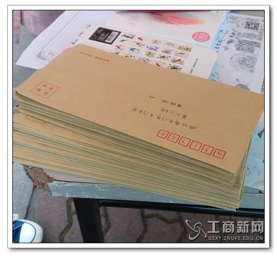 活动开始前,志愿者们将精心准备的明信片、信封以及邮票摆放在桌子上,等待同学们前来选用。