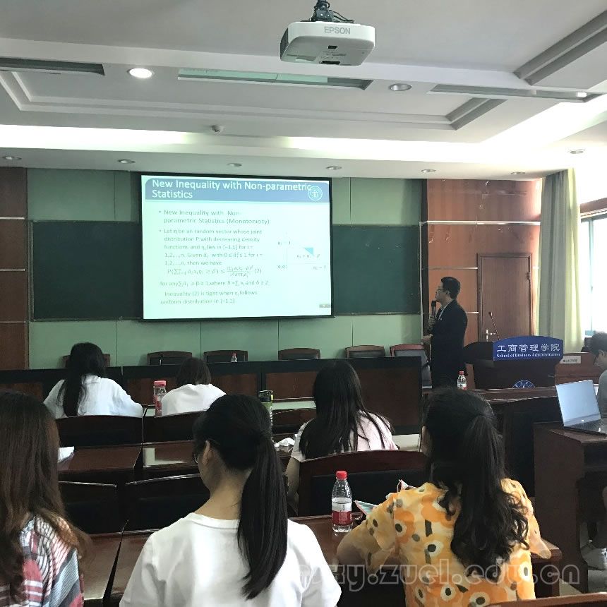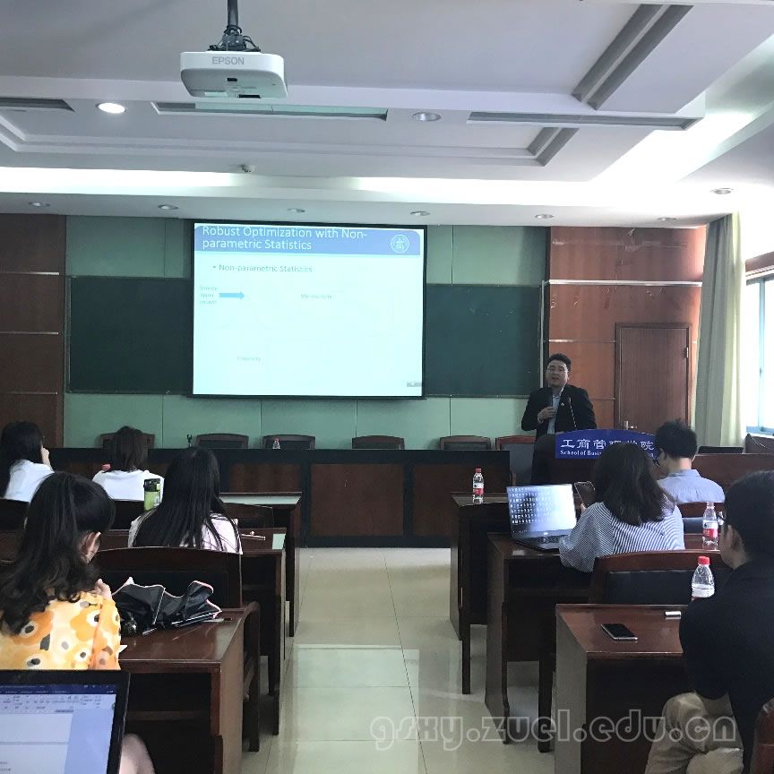 徐教授用幽默风趣的语言风格,对股票投资的基本原理进行了通俗易懂的解释,并且展示该模型真实运用的数据统计。之后,在座教师和学术积极地与徐教授探讨交流,现场气氛热烈。交流过后,董慈蔚老师对此次讲座做出总结,高度赞扬了徐教授的研究成果,指出该研究将实际问题上升为理论高度,突破性地将具有约束的随机优化问题转化为一般可解线性规划问题,并对管理科学方法在金融领域的应用具有重要的启示作用。在众师生的掌声中,本次讲座取得圆满成功。