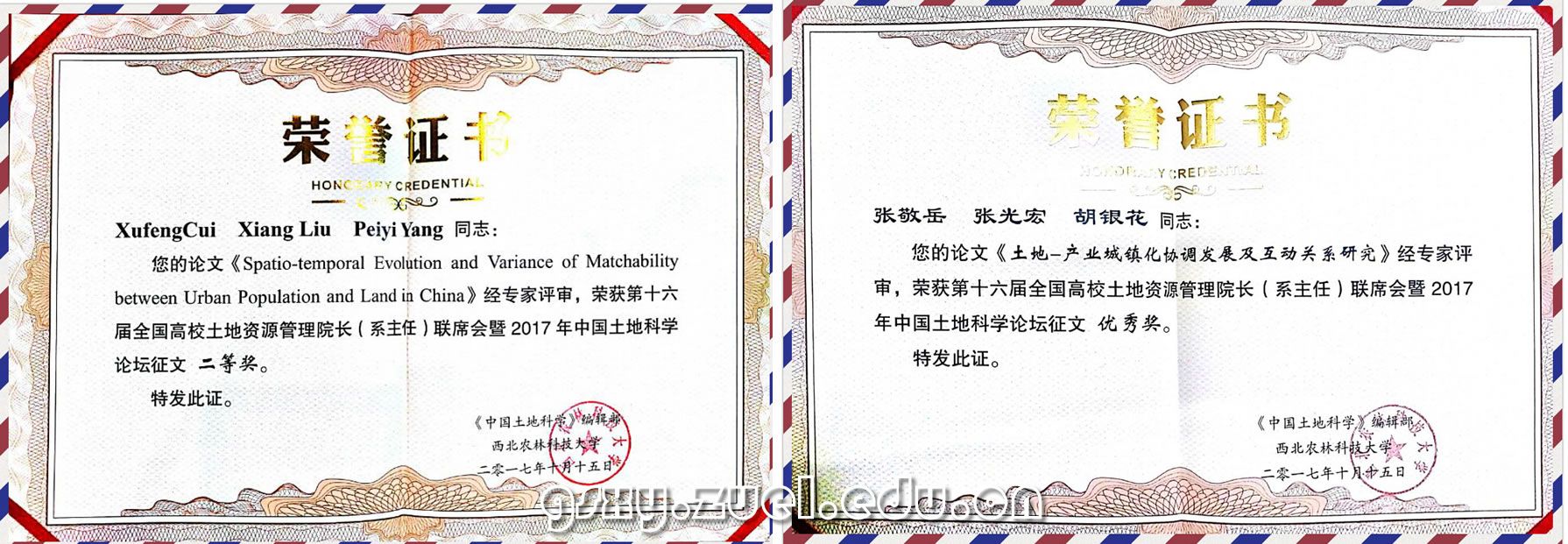 文,由崔许锋、刘翔、杨佩仪撰写的论文《Spatio-temproal Evolution and Variance of Matchability between Urban Population and Land in China》获得“二等奖”,由张敬岳、张光宏等撰写的论文《土地-产业城镇化协调性及互动关系研究》获得“优秀奖”。