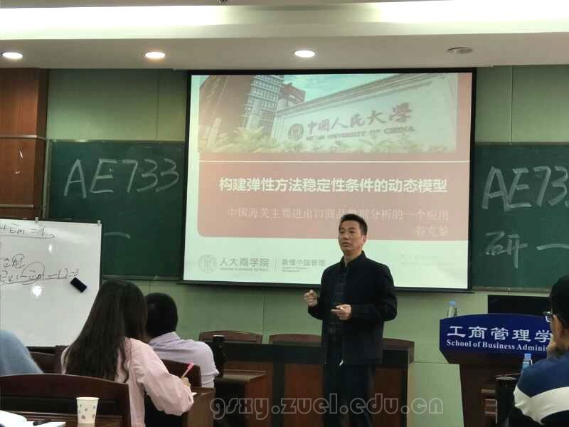 由红宝石最新线路手机版主办的“文泉工商•长江论坛第五期”于2017年10月22号上午在文泉北楼506会议室成功举办。中国人民大学谷克鉴教授以“构建弹性方法稳定性条件的动态模型:中国海关主要进出口商品数据分析的一个应用”为主题,分享了最新的研究成果。钱学锋教授、赵曜副教授、闫文收博士、毛海涛博士,以及博士生和硕士生近100人参加报告会。曹亮教授主持报告会。