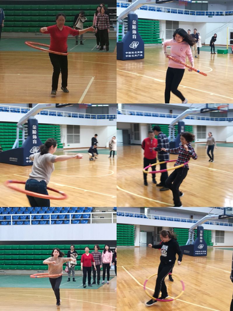 呼啦圈竞走是一项接力比赛,比赛长度为1人50米,边转呼啦圈边跑,在比赛进行当中呼啦圈不可以掉下来,如果掉下来,捡起来是呼啦圈转起来后再继续行走,直到完成比赛.比赛以用时最少的为胜利。比赛过程中,我院参赛教师争分夺秒,相互配合用最快的速度将呼啦圈接力给自己的队友,并圆满的完成了此项项目。