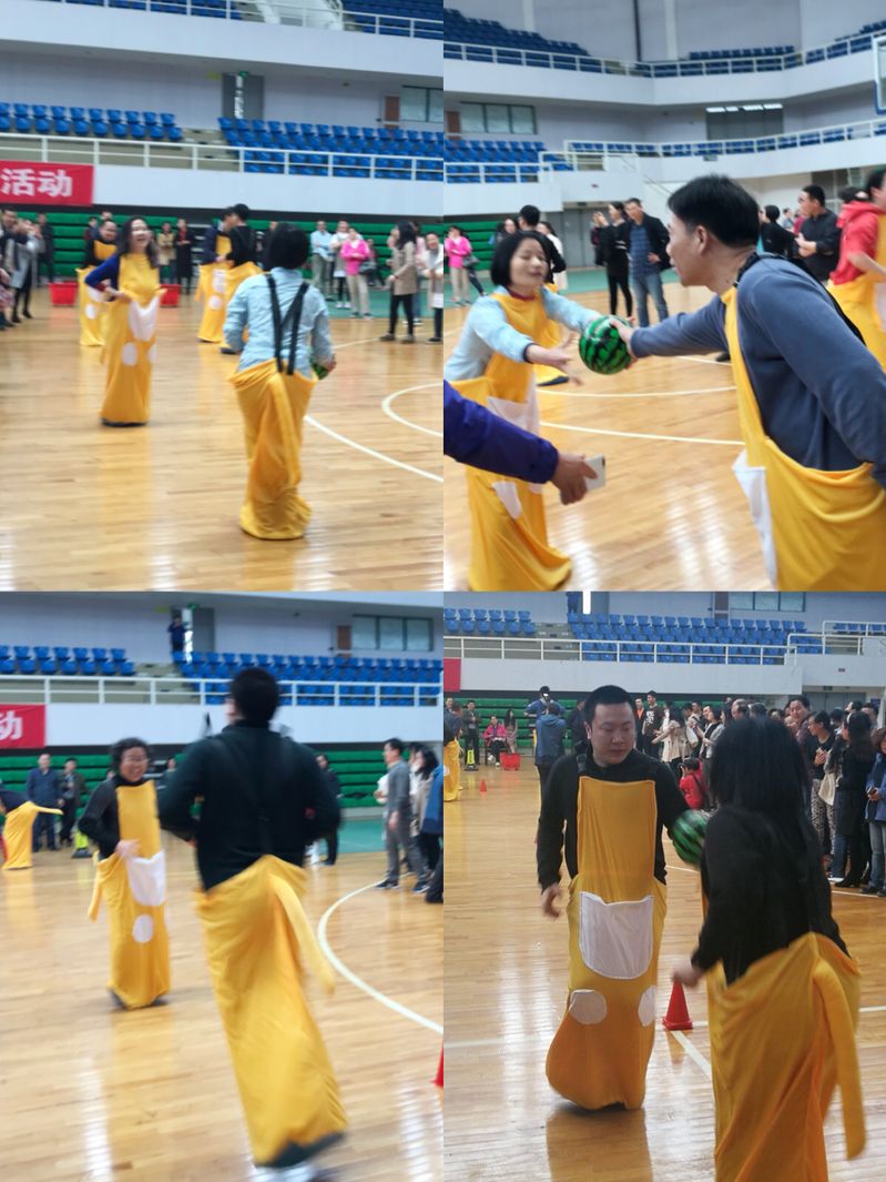 此次游艺活动包括三个项目:袋鼠运瓜、企鹅漫步和呼啦圈竞走。袋鼠运瓜需要四名运动员相隔一定距离依次站好,A端1号队员抱球跳向B点,将球交给B点2号队员后返回起点取球;2号队员抱球跳向C点,将球交给C点的3号队员后返回B点球;3号队员抱球跳向D点,将球交给D点的4号队员后返回C点接球;4号队员抱球跳向终点,将球放进球筐后返回D点接球。赛程为60米,以最后一球落筐为计时停止,用时少者名次列前。比赛开始,我院教师们齐心协力“运瓜”,团队配合的非常完美。