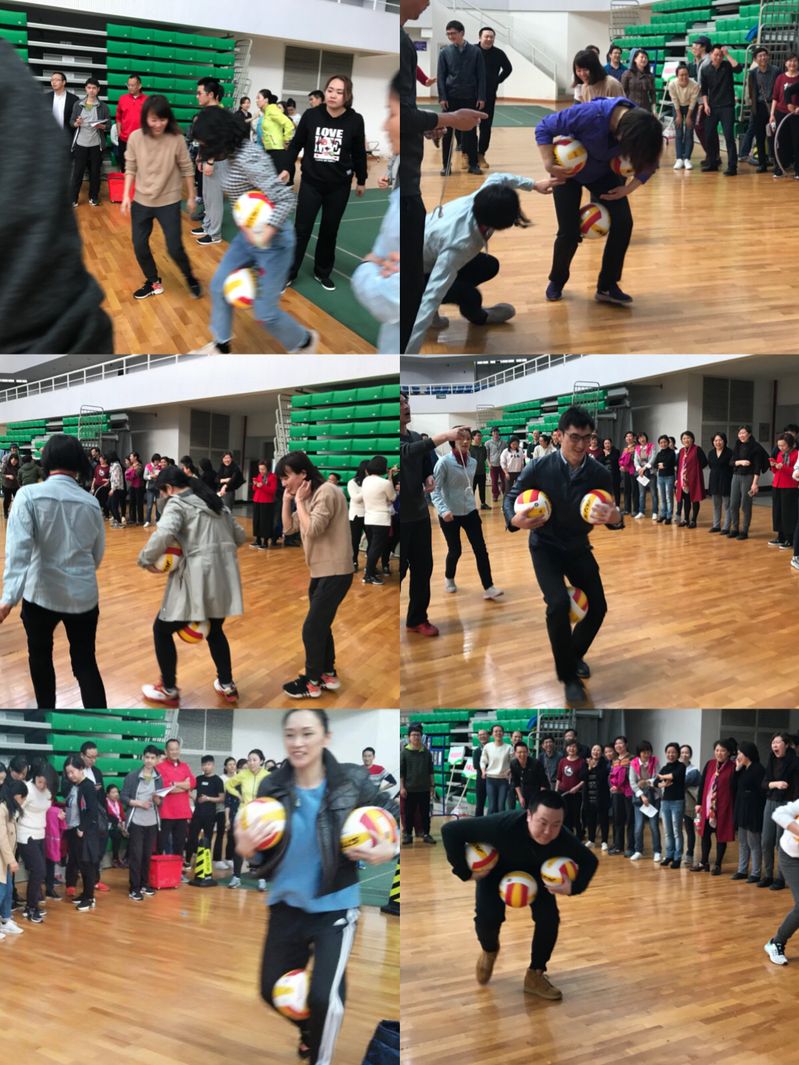 企鹅漫步是指参赛人员须两腿两手夹球3个,通过用手抱球和腿夹球的方式将3个球运送到下一位参赛者手里完成接力,中间掉球的须返回起点重新开始,最先到终点的队员获胜。比赛伊始,我院参赛教师便有条不紊的夹着球稳步前进,其他老师则在一旁辅助参赛老师,帮他们拾起在比赛途中掉下的球。运球的过程十分有趣,逗乐了在一旁观赛的老师们。最终,我们取得了全校第三名的好成绩。