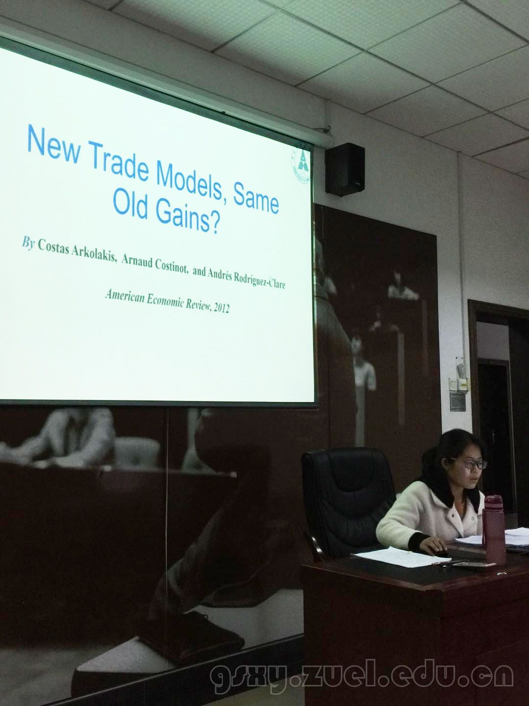 由红宝石最新线路手机版经济贸易系举办的文献分享会(2018年春季)第1期于2018年3月14日晚在文泉楼德鲁克会议室举行。在此次文献分享中,国际贸易教研室青年教师李敬子副教授为大家讲解了Arkolakis等人于2012年发表于American Economic Review上的论文《New Trade Models, Same Old Gains?》。红宝石最新线路手机版经济贸易系钱学锋教授、文澜学院陈泰良副教授、华中科技大学经济学院周记顺博士、红宝石最新线路手机版席艳乐副教授、胡宗彪副教授、赵曜副教授、刘凯博士、何祚宇博士、闫文收博士,以及部分博士生和硕士生参加此次文献分享会。毛海涛博士主持分享会。