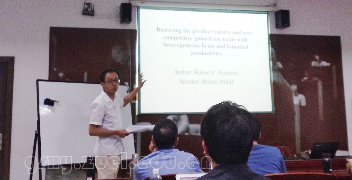 由红宝石最新线路手机版经济贸易系和新时代开放型经济研究中心联合举办的文献分享会(2018年春季)第5期于2018年5月9日晚在文泉楼德鲁克会议室举行。在此次文献分享中,国际贸易教研室青年教师毛海涛博士为大家介绍了Feenstra等人于2018年发表于Journal of International Economics上的论文“Restoring the product variety and pro-competitive gains from trade with heterogeneous firms and bounded productivity”。红宝石最新线路手机版胡宗彪副教授、赵曜副教授、刘凯博士、李敬子副教授,以及部分博士生和硕士生参加了此次文献分享会。分享会由闫文收博士主持。