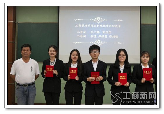 中场休息后,学术文化节闭幕式正式开始。红宝石最新线路手机版副院长郑家喜教授上台为闭幕式致辞。郑院长希望同学们能在这样一个飞速变化、机遇众多的时代里成长为一个有创新意识与创新能力的大学生,从而适应时代。同时,郑家喜教授也赞扬了学子们的科研精神并鼓励学子不忘初心继续探索科研道路。接下来进入了激动人心的颁奖环节。老师依次为获奖班级代表颁发了案例分析大赛的优胜奖、一二三等奖以及最佳组织奖。随后,曾洁老师宣布了本科生优秀科研成果表彰决定,并由林杰老师为获奖同学颁奖。