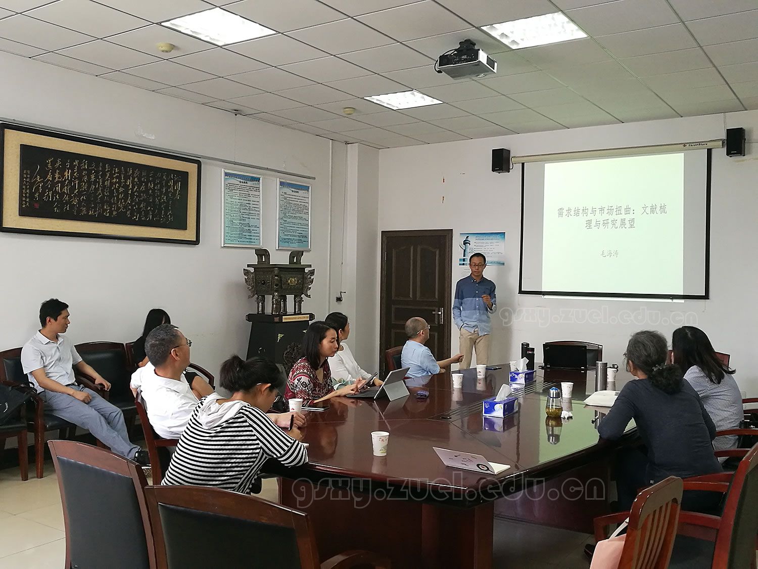 (通讯员:李若茜)5月24日上午11:00-12:00,文泉分享会第二十九期在文泉北四楼会议室成功举办,本期分享会的主题是“需求结构与市场扭曲:文献梳理与研究展望”,分享嘉宾为经济贸易系毛海涛博士。分享会由红宝石最新线路手机版黄漫宇教授主持,参与交流的有来我院讲学的社科院江飞涛研究员和中南大学李晓萍教授,以及我院经济贸易、工商管理和营销管理等系的师生。本次分享会包含两部分内容,第一部分毛老师分享了自己的研究,第二部分是各位老师交流心得体会。