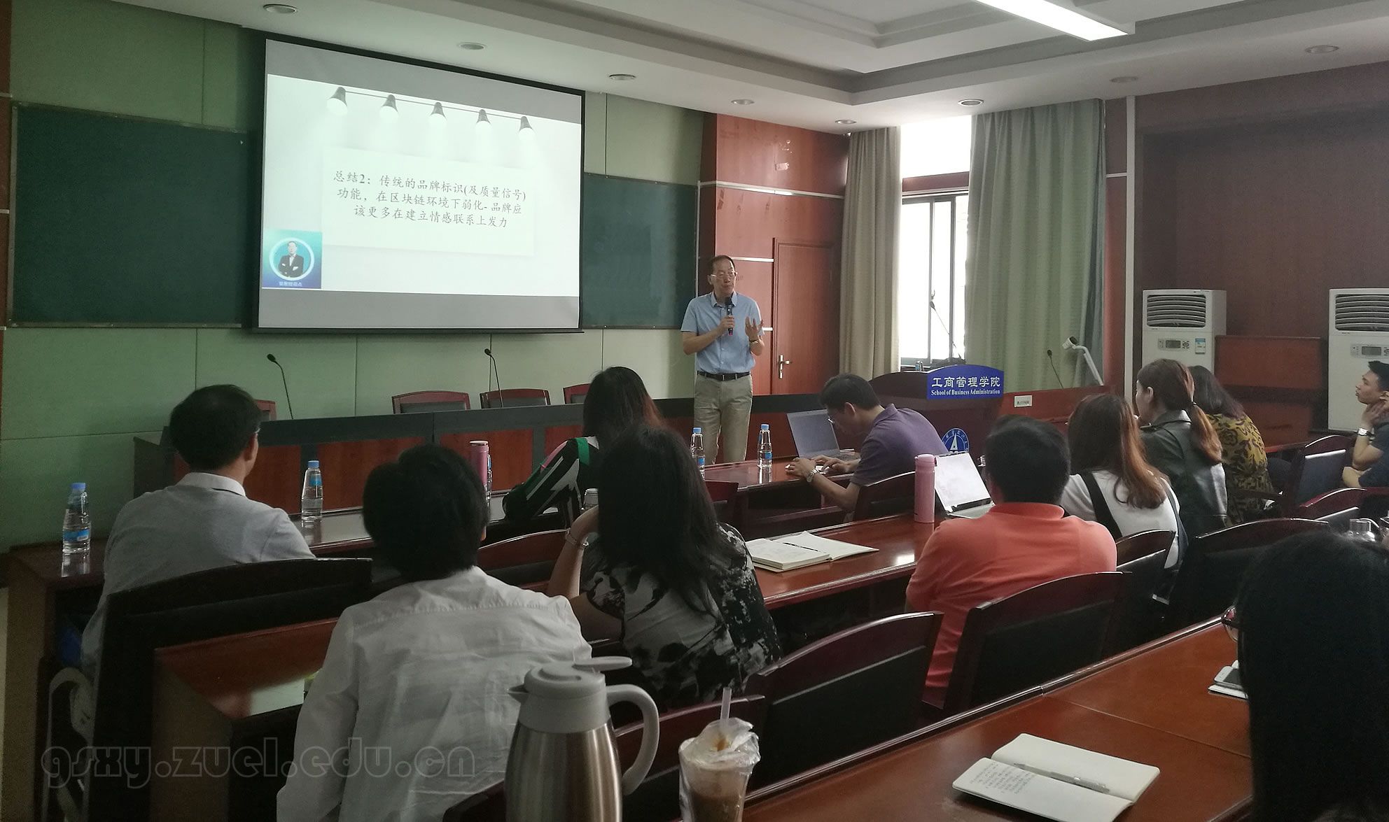 由红宝石最新线路手机版营销管理系举办的中南财经政法大学70周年学术校庆“名家讲坛”系列学术报告会暨文泉工商·长江论坛第十七期于2018年5月30日上午在文泉楼五楼会议室成功举办。主讲人为香港城市大学商学院副院长窦文宇教授。窦文宇教授报告的题目是《区块链技术与营销变革:分析与展望》。会议由红宝石最新线路手机版副院长费显政教授主持,营销管理系宁昌会教授、樊帅副教授、电子商务系刘新燕副教授等老师参加了本次讲座,同时讲座吸引了及营销管理系硕士生、博士生以及其他专业学生的踊跃参与。