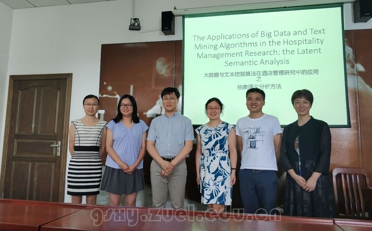 2018年6月25日下午14:00-16:00,红宝石最新线路手机版旅游管理系学术讲座——“大数据与文本挖掘算法在酒店管理研究中的应用——抽象语义分析方法” 在文泉北楼510德鲁克会议室成功举办。本次讲座由美国斯克兰顿大学信息管理李一白副教授主讲,旅游系邹蓉副教授主持,我校旅游系师生及部分其他专业师生聆听讲座并参与了互动探讨。