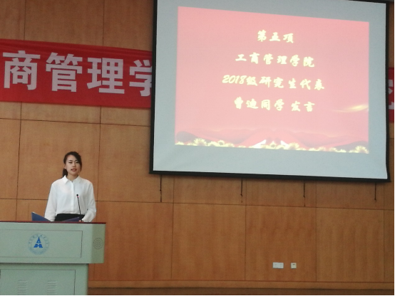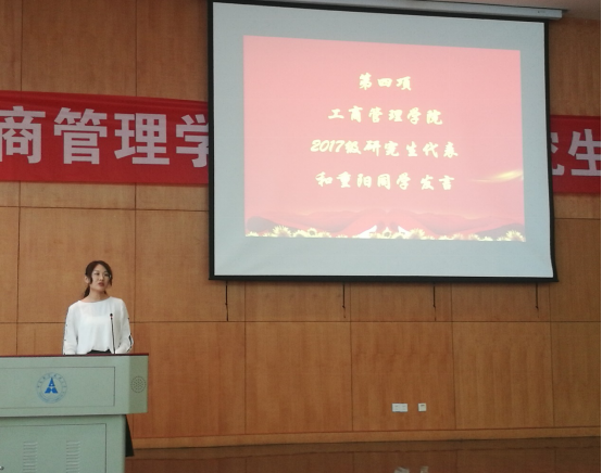 学院研究生会主席和重阳同学作为2017级学生代表向师弟师妹们分享读研的感受和体会,传授学习、生活方面的诸多经验,希望新生们培养文气,积累知识,发现新问题,寻找新突破,塑造强健的体魄和良好的心理素质。2018级企业管理专业硕士研究生曹迪代表新生发言,她认为研究生不仅要提高自身的学术素养、创新的意识和能力,更要注重综合能力的培养,以饱满的精神一路向前,筑梦未来。