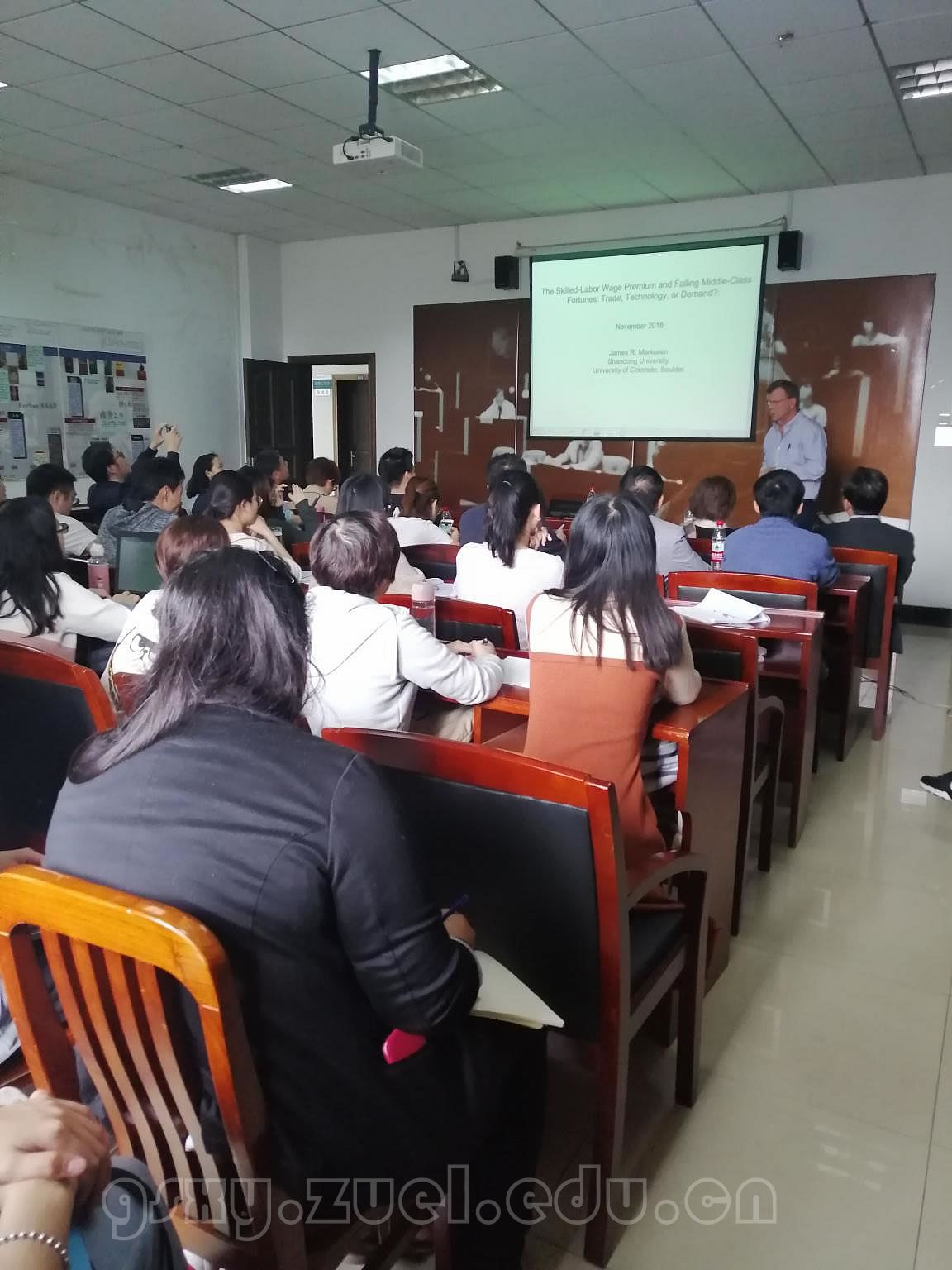 由红宝石最新线路手机版经济贸易系和新时代开放型经济研究联合举办的经济贸易系Seminar2018年第22期于2018年11月4日上午在文泉北5楼德鲁克会议室成功举办。本次学术报告会上,来自University of Colorado Boulder的James R. Markusen做了题为“The skilled-labor wage premium and falling middle-class fortunes:trade,technology or demand?”的主题演讲,红宝石最新线路手机版经济贸易系钱学锋教授、田毕飞副教授、吴英娜副教授、李敬子博士、闫文收博士、毛海涛博士、刘凯博士以及各系博士生、研究生等参加了本次学术报告会。本次报告会由吴英娜副教授主持。