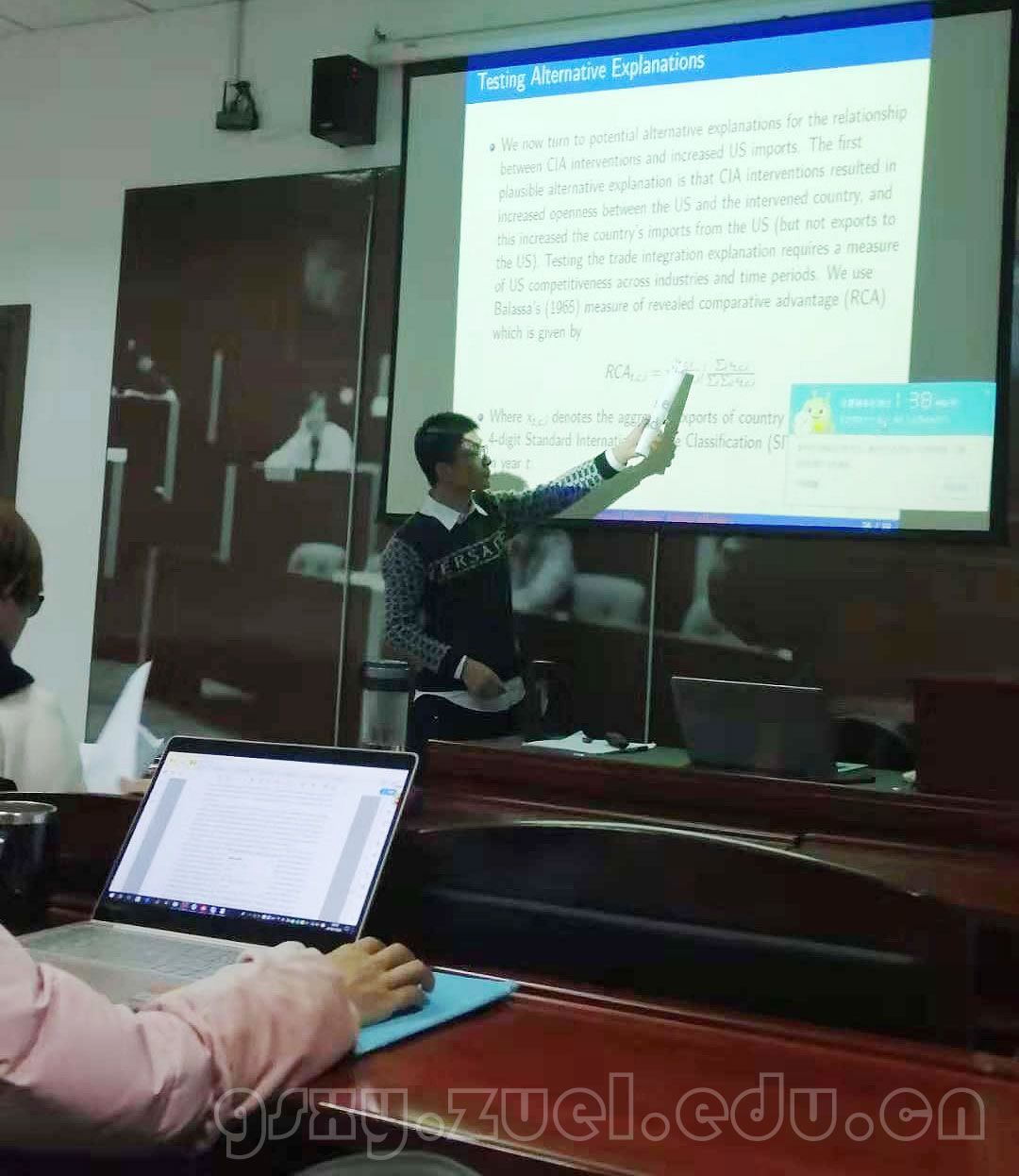 首先,许捷老师介绍了这篇论文的边际贡献:为历史上存在的通过政治手段影响贸易行为的现象提供经验证据。具体研究方法为计量分析法,他通俗地将论文中主要的三种方法比喻为:扫雷、挖地道、炸桥三种游戏任务。在构建计量模型的时候,为了能够满足数据可得性要求,作者采用第一种方法“扫雷”,在进行影响机制检验的时候采用第二种方法“挖地道”,在排除其余可能影响机制的时候采用第三种方法“炸桥”。这种比喻激起了学生们的浓厚兴趣,并带来了笑声和掌声。