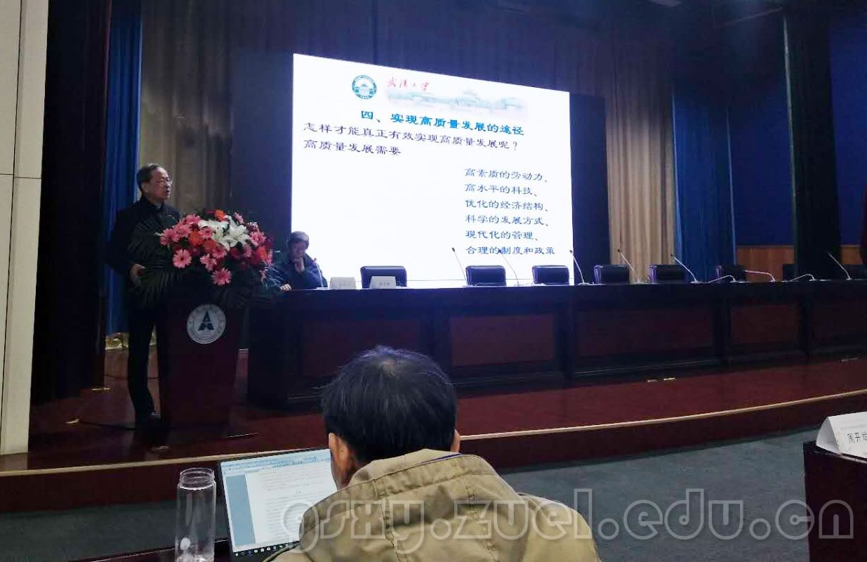 2018年12月8日上午,由红宝石最新线路手机版、现代产业经济研究中心主办的产业前沿讲座2018年第17讲(总第69期)于中南财经政法大学南湖校区文泉学术报告厅成功举办。本次讲座由武汉大学经济研究中心简新华教授主讲,主题是“从高速度增长到高质量发展”。研究生院院长胡立君教授主持了本次讲座。红宝石最新线路手机版胡立君教授、汪海粟教授、任剑新教授、石军伟教授等教师及产业经济学专业博士生、硕士生参加。