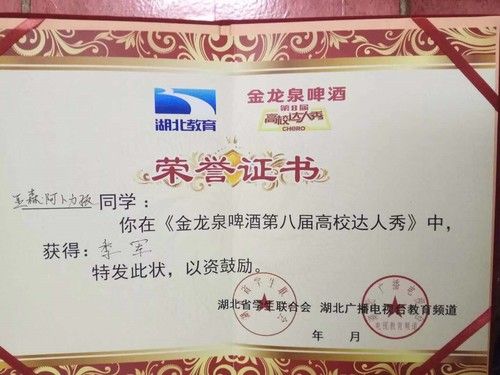 (通讯员 汪齐)12月19日晚,由共青团湖北省委、湖北广播电视台指导,湖北省学生联合会、湖北广播电视台教育频道联合主办的“金龙泉啤酒第八届高校达人秀”总决赛在江汉大学文理学院落下帷幕,我院学子亚森·阿卜力孜获“金龙泉啤酒第八届高校达人秀”季军。