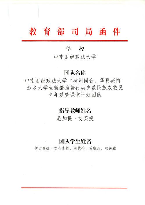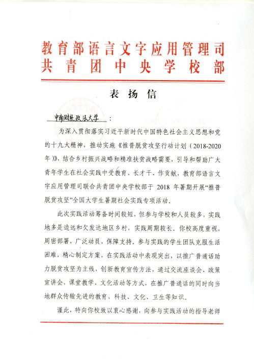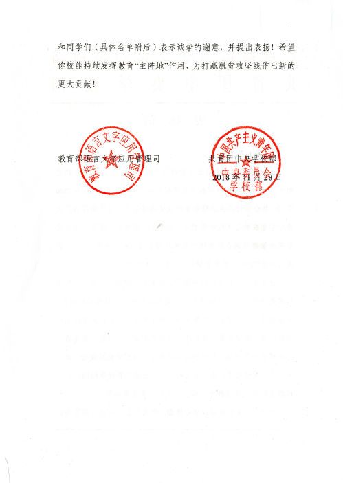 (通讯员 伊力夏提·艾合麦提)近日,教育部语言文字应用管理司和共青团中央学校部向我校发来表扬信。表扬信提到,你校高度重视,周密部署,广泛动员,保障支持。参与实践的学生团队克服生活困难,精心制定方案,在实践活动中表现突出,以推广普通话助力脱贫攻坚为主线,创新教育宣传方法,通过交流座谈会、政策宣讲会、课堂教学、文化活动等方式,在推广普通话的同时向当地群众传输先进的教育、科技、文化、卫生等知识。谨此,特向你校致以衷心感谢,向参与实践活动的指导老师和同学们表示诚挚的谢意,并提出表扬!希望你校能持续发挥教育“主阵地”作用,为打赢脱贫攻坚战作出新的更大贡献。