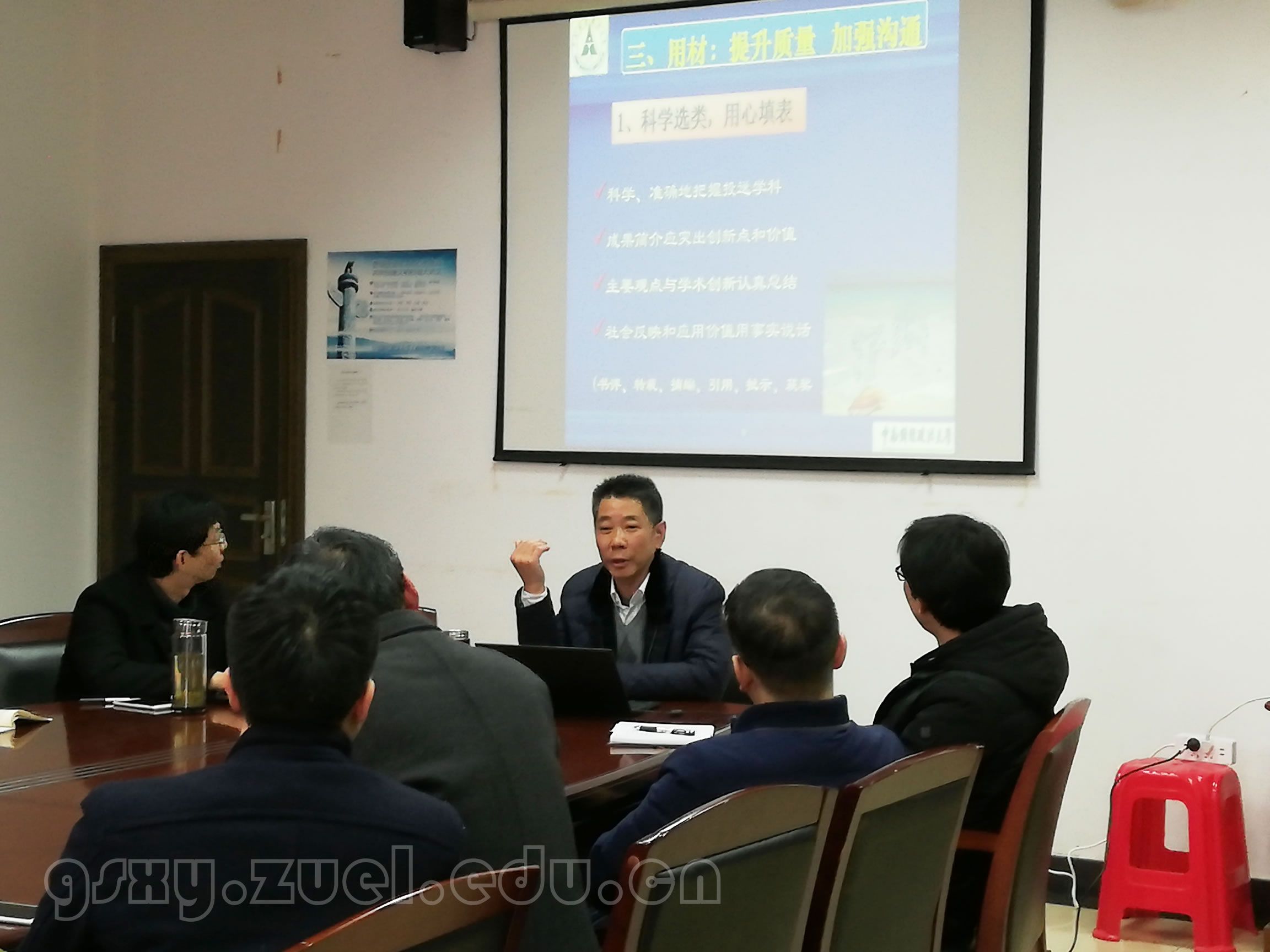 主动采用材料等具体对策。接着,陈池波教授根据切身经历,就用材方面提出了自己的看法,提出了科学选类和加强沟通两点要求。陈教授认为应科学准确把握投送学科、突出成果创新性与价值,注重主要观点与学术创新的总结、用事实说话。同时用幽默风趣的语言讲述了注意沟通与关注程序的重要性,尤其关注初评环节,更应注意沟通,力争入围。最后,陈教授表达了对在座教师的鼓励与期待,希望各位老师能获得更好的奖项。