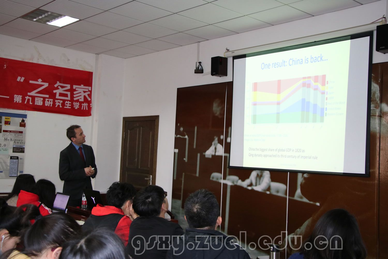 在本次学术报告会上,Andrew Farlow教授首先介绍了2008年金融危机后美国、中国、希腊等经济体的经济形势。进一步Andrew Farlow教授总结了在世界贸易、全球化和保护主义不断变化形态的经济背景下,政策制定者应该采取的措施。更具体的,Andrew Farlow教授以中国为例,指出目前中国正面临着人口老龄化、劳动力成本持续上升的挑战,在发展中存在着储蓄、固定投资和消