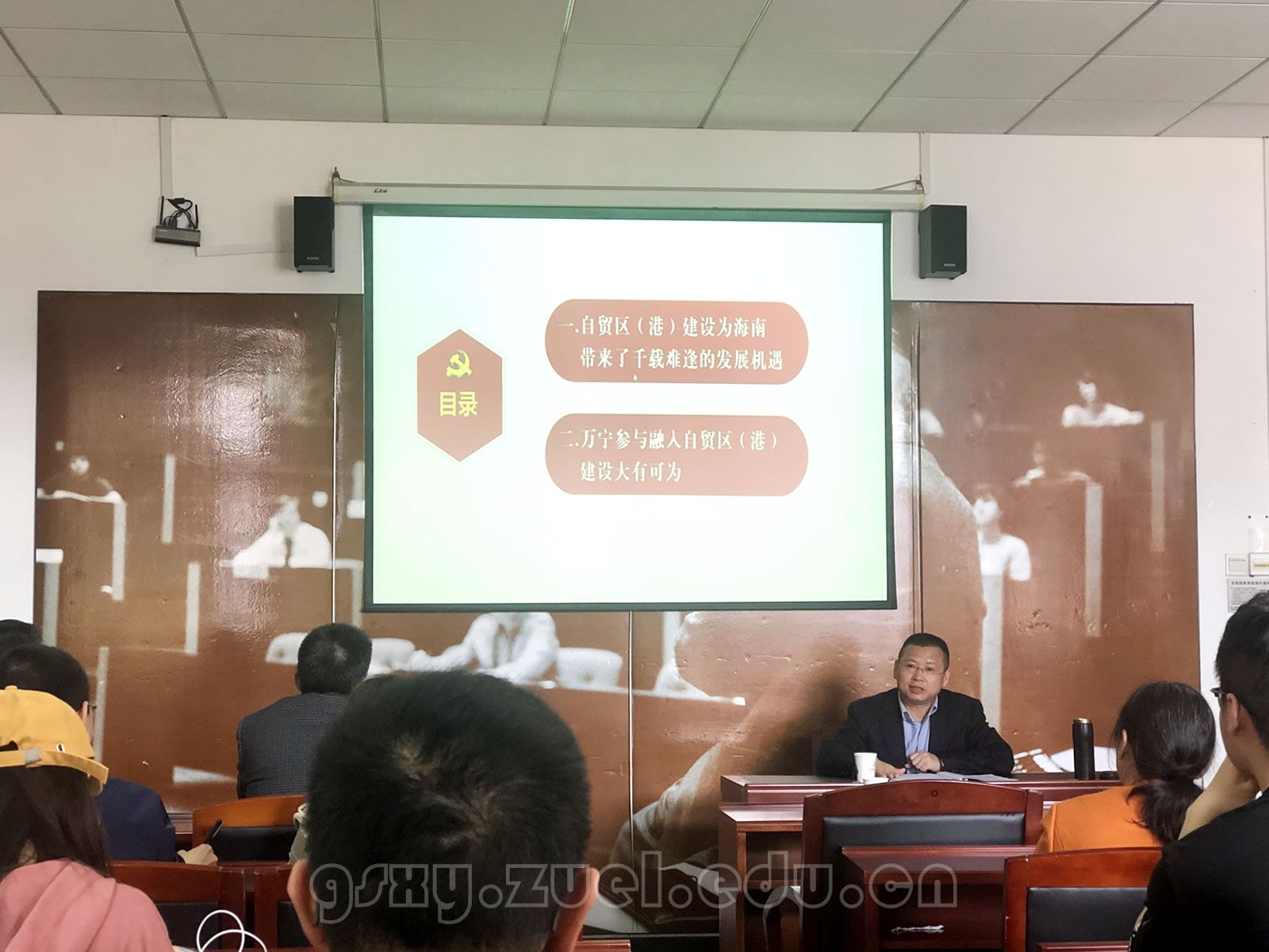 张美文在海南工作近30年,历任海南省海口市财政局局长、海南省财政厅副厅长、儋州市副市长、万宁市市长等职。报告中,张美文结合海南建省办经济特区30多年来取得的成绩、新时代经济特区的新使命和新定位,系统解读了海南自贸试验区的建设背景、发展定位、功能划分及重要政策,综合分析了海南自贸试验区建设的机遇和前景。报告对习近平总书记“4.13”重要讲话精神进行了系统解读,对海南建设自由贸易试验区和中国特色自由贸易港的战略任务进行了详细分析,对万宁市承接自贸区(港)建设的政策进行了综合