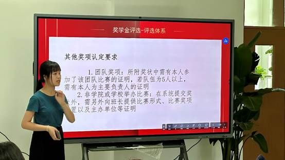 班会第二环节,班长余文欣为同学们梳理了新学期班级工作计划。其结合图文视频以及个人案例,为同学们讲解了新学期同学们在进行家庭经济困难学生认定、本科生评奖评优以及填写2024学年鉴定表时应该注意的要点,并提醒同学们应根据操作手册以及相关要求严格填写。