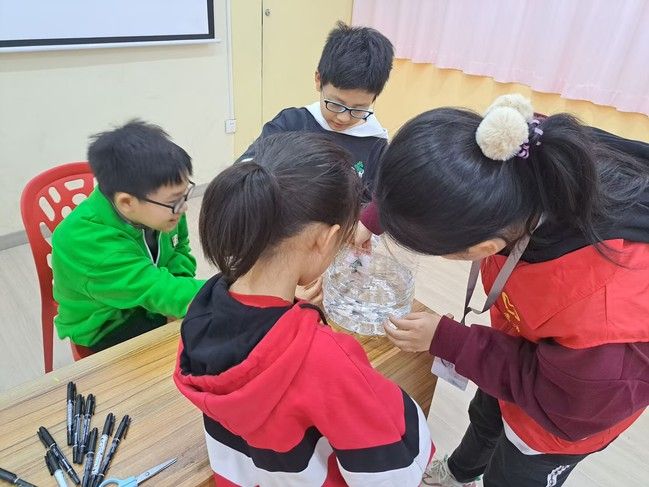 实验唤新知,科学启新程。在11月9日的科学实验主题活动中,志愿者们组织小朋友们进行“消失的颜色”趣味实验。引人入胜的实验科普视频吸引着所有小朋友的目光,瞬间激发起他们的好奇心与探索欲。紧接着,在志愿者的悉心指导下,小朋友们先是认真地在纸片上画上鲜艳的图案,用塑封膜将其封住,而后用黑色马克笔在塑封膜上描绘出图案的轮廓。塑封膜放入水中的那一刻,神奇的一幕发生了——色彩鲜艳的图案“消失”了。小朋友们不禁发出阵阵惊叹,迫不及待地想要知道科学原理,催促着志愿者们进行讲解。他们那一双双闪烁着光芒的眼睛,饱含着对知识的纯粹渴望。